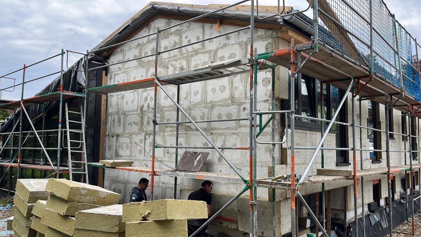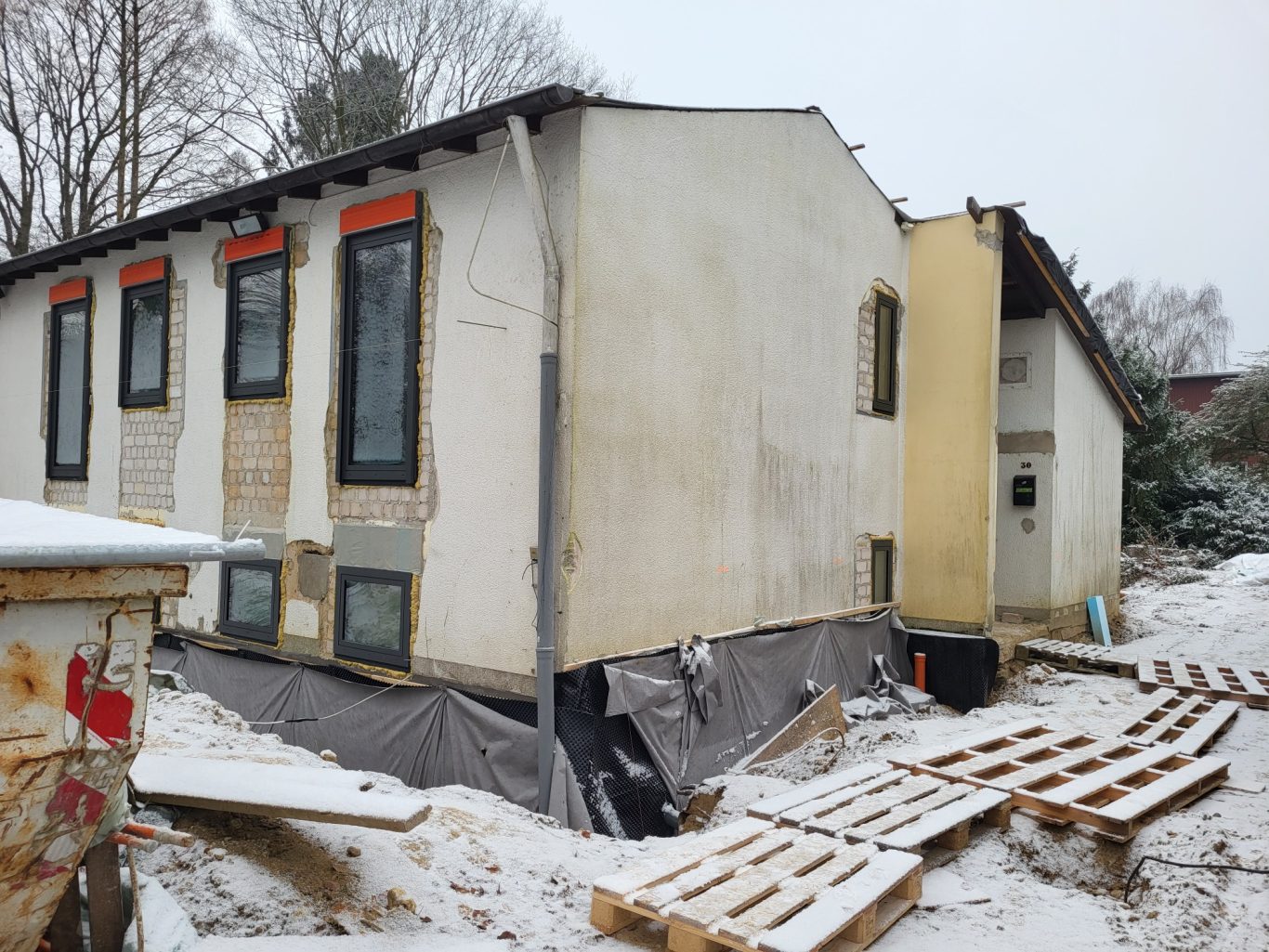 Im Rahmen der energetischen Sanierung wurde die Gebäudehülle vollständig erneuert. Dazu gehörten die Fassaden- und Dachdämmung sowie der Austausch aller Fenster und der Haustüranlage, um den aktuellen technischen Standards zu entsprechen.